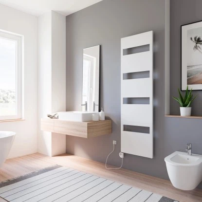 Der steckerfertige Schulte Badheizkörper Turin mit Heizstab kennzeichnet sich durch seine beinahe vollflächige Front, die nur durch einige Ausschnitte unterbrochen wird. In diesen können Sie wunderbar Ihre Handtücher aufhängen – egal, ob zum Trocknen nach oder zum Aufwärmen vor dem Gebrauch. Diese ausgefeilte Optik geht mit einer starken, zuverlässigen Wärmeleistung einher, welche Ihre Räumlichkeiten langfristig und zufriedenstellend heizen wird.