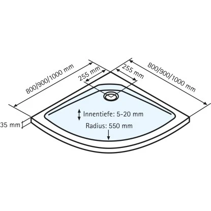 Die extraflache runde Duschwanne hat die Maße 80 cm x 80 cm und ist Alpinweiß. Der Radius beträgt 55 cm.