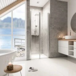 Der durchgehende Magnetverschluss der Duschkabine garantiert ein perfektes Abdichten der Tür. Die beiden Türen öffnen nach innen und außen. So bietet diese Pendeltür einen großzügigen Einstieg, spart jedoch gleichzeitig eine Menge Platz. Der verdeckte Heb-Senk-Mechanismus garantiert eine erhöhte Dichtigkeit und ein zuverlässiges Schließverhalten der Türen.