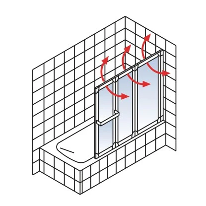 Diese dreiteilige Badewannenfaltwand mit einer feststehenden Seitenwand von Schulte zeichnet sich insbesondere durch ihre dominante Rahmung aus. Außerdem können die einzelnen Elemente der Faltwand für eine optimale Raumnutzung, auch in kleinen Bädern, um 360° gedreht und platzsparend an die Wand gestellt werden.