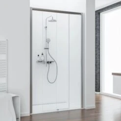 Die Schiebetür in Nische Kristall/Trend wird ohne unteres Profil geliefert und ermöglicht dadurch einen komfortablen Einstieg ohne lästige Schwelle. Durch das platzsparende Öffnen ist die Schiebetür auch für kleinere Bäder optimal geeignet. Das 8 mm starke Sicherheitsglas (Tür, Nebenteil: 6 mm starkes Sicherheitsglas) und die stabilen Aluminiumprofile verleihen der Dusche einen sicheren Stand.