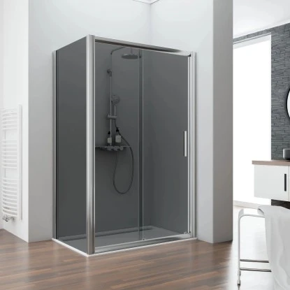 Die Seitenwand passt zur Schiebetür ohne unteres Profil der Serie Kristall/Trend von Schulte. Die Seitenwand wird links von der Schiebetür ohne unteres Profil montiert. Das 8 mm starke Sicherheitsglas und die stabilen Aluminiumprofile verleihen der Dusche einen festen Stand.